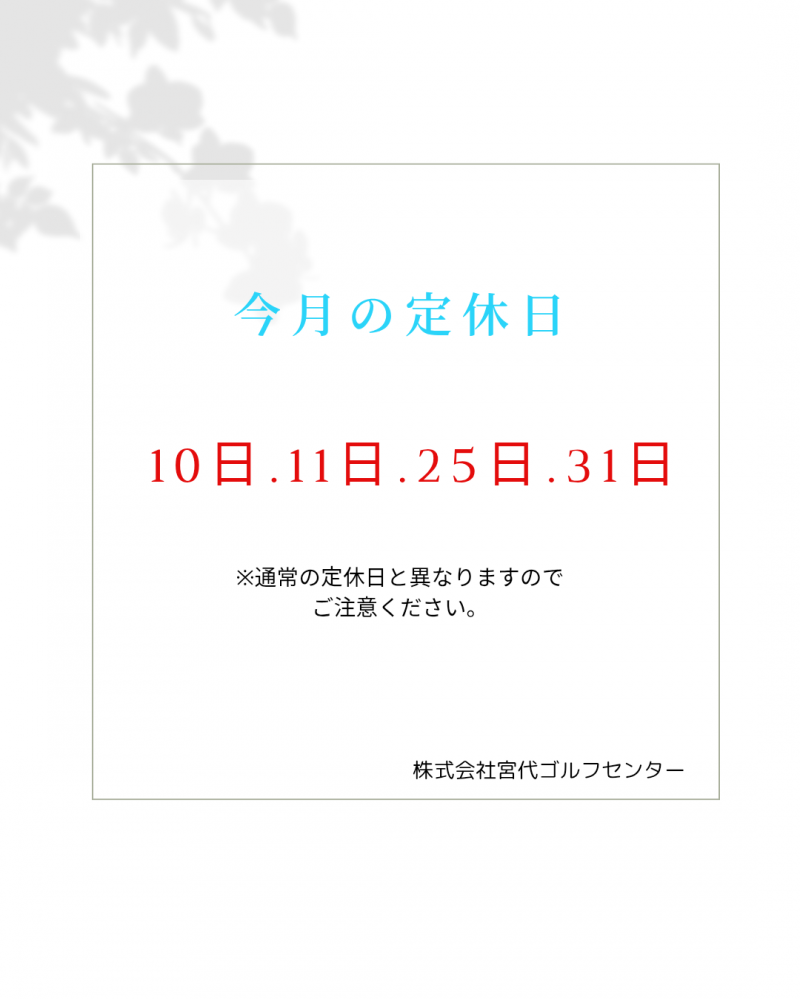 通常ですと第2、第4木曜日が定休日ですが、今月は11日の水曜日もお休みとさせていただきます。